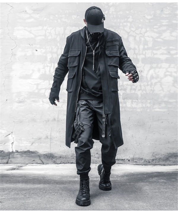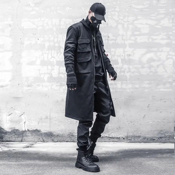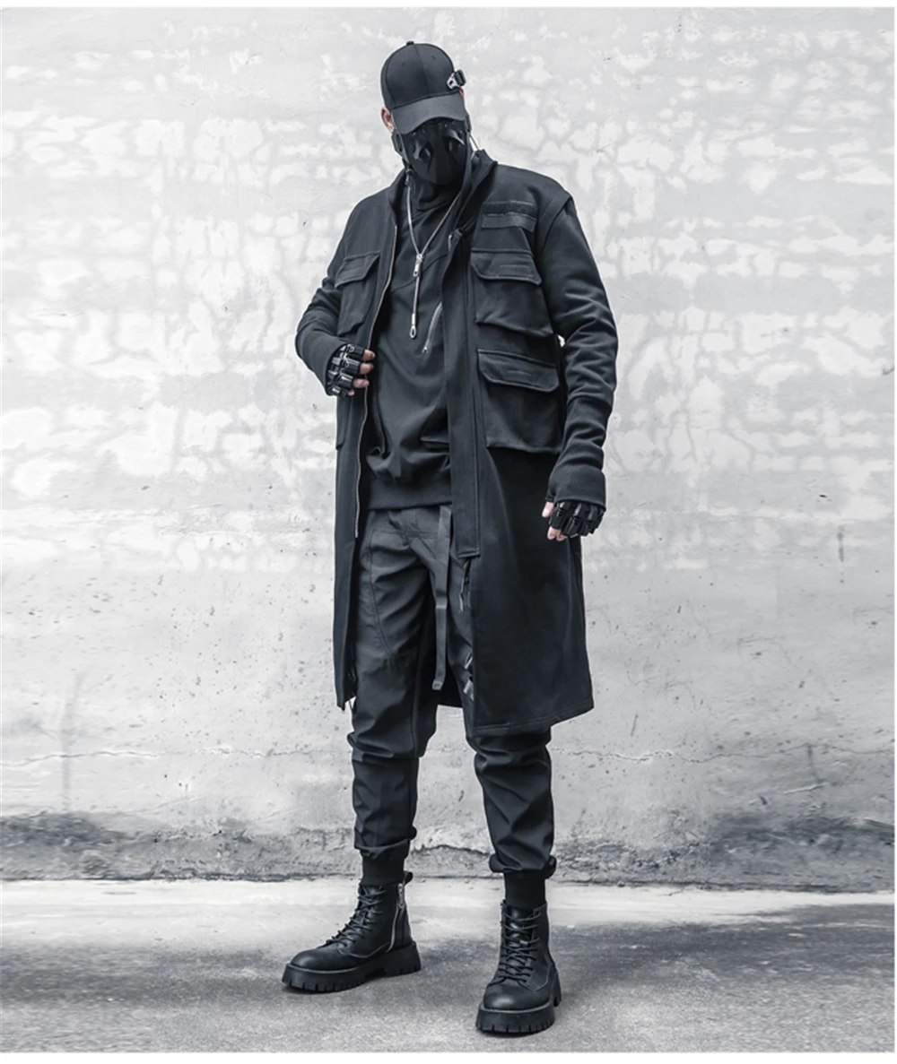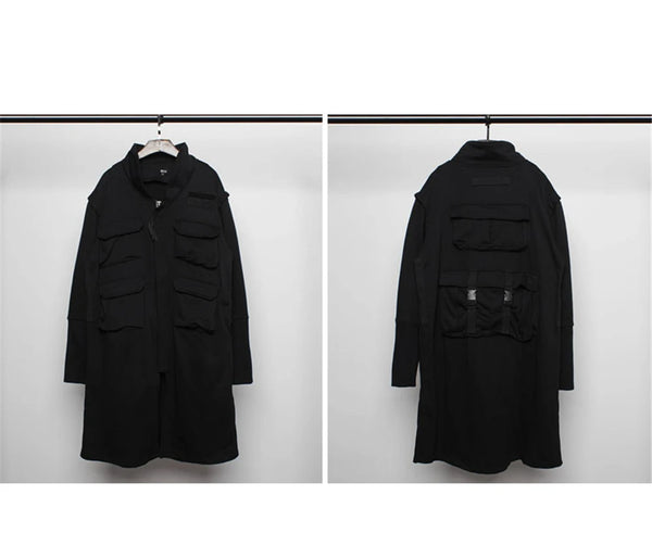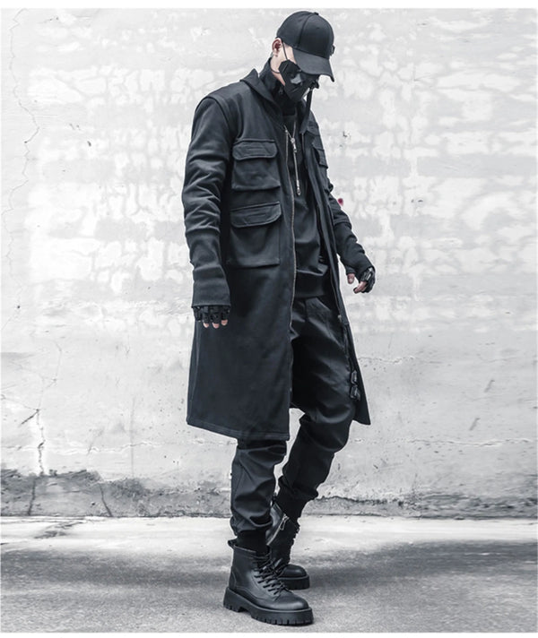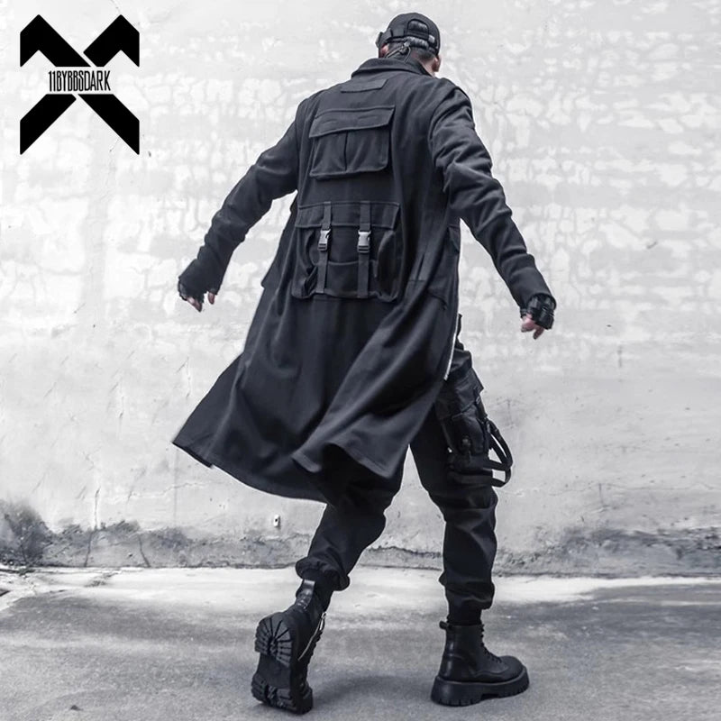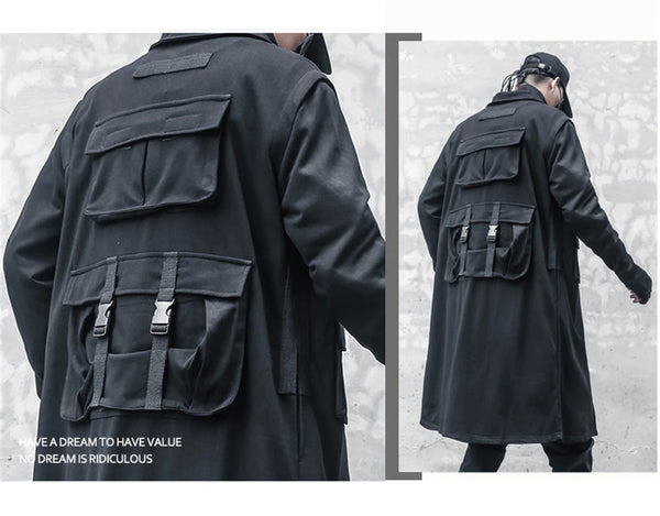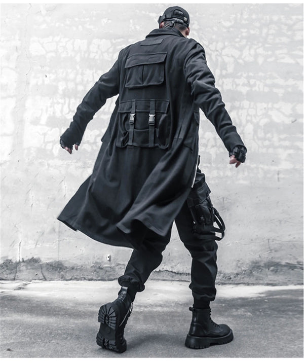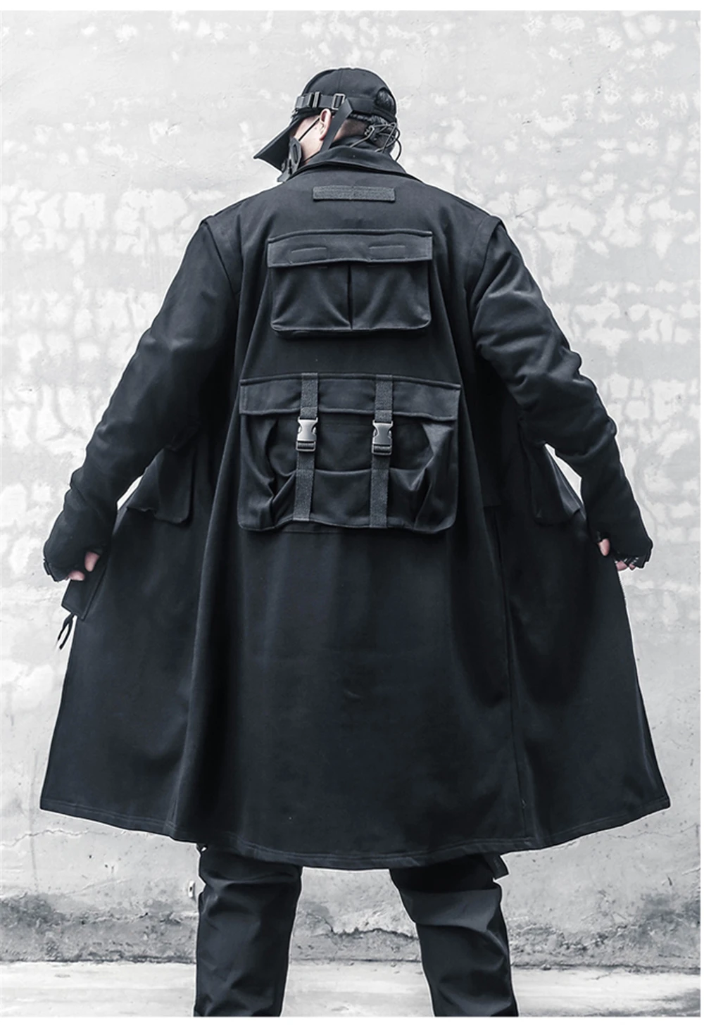 Men's black long trench coat with multi pockets, gothic punk design, perfect for autumn and spring streetwear fashion.