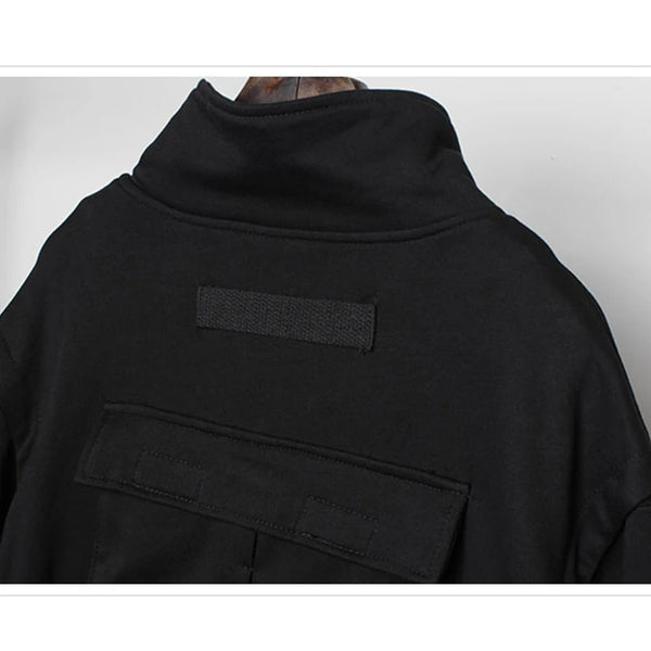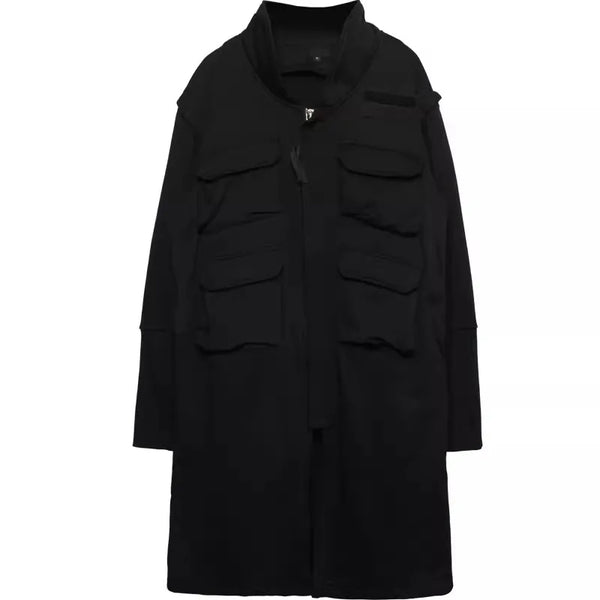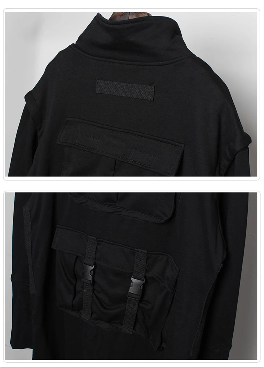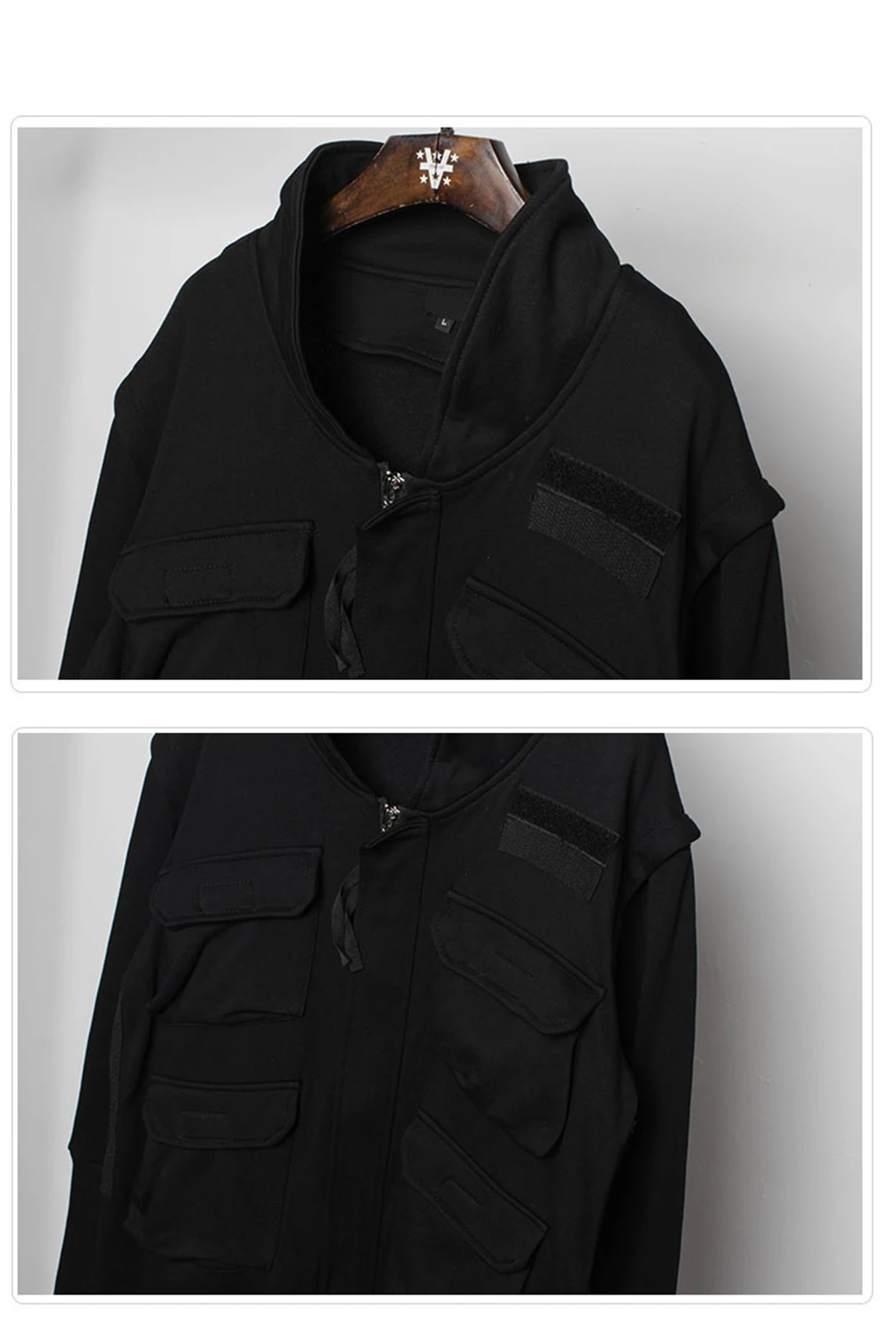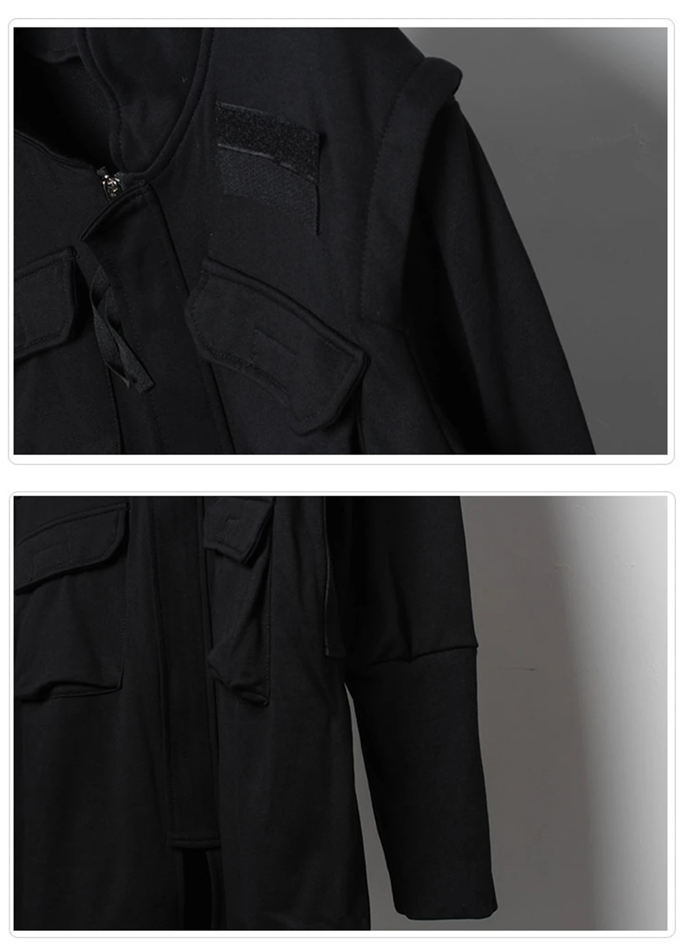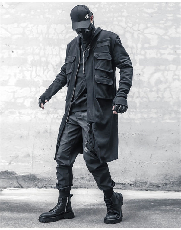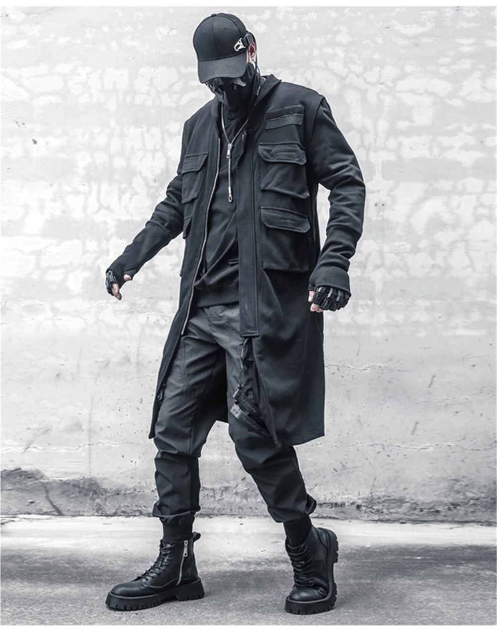 Men's black long trench coat with multi pockets, gothic punk design, perfect for autumn and spring streetwear fashion.