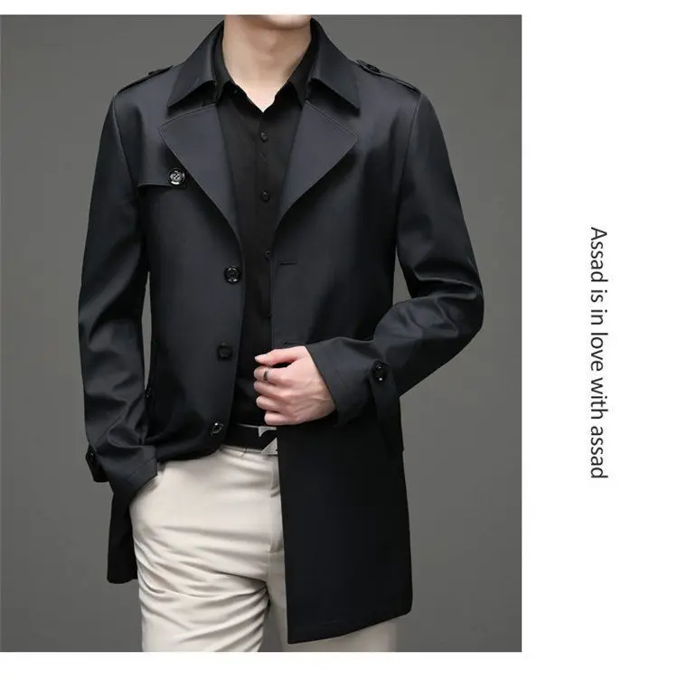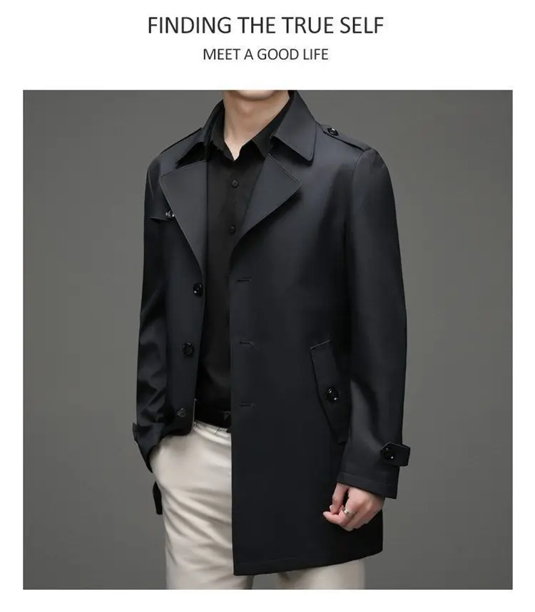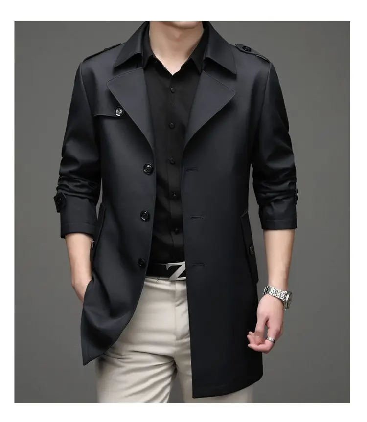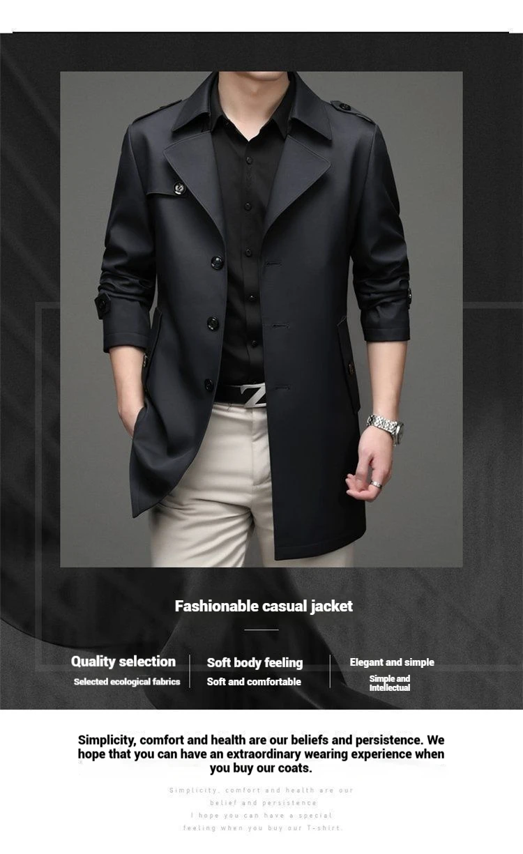 Experience timeless elegance and superior comfort with our Classic Men's Long Trench Coat, perfect for spring and autumn wear. Crafted for the modern man, this coat combines functionality with style, making it an ideal choice for business casual attire or sophisticated everyday wear. The sleek, single-breasted design and turn-down collar enhance its classic appeal, ensuring you look sharp whether you're on a business trip or enjoying a weekend outing.