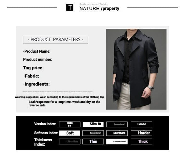Classic men's long trench coat in lightweight polyester, perfect for spring and autumn business casual and stylish everyday w