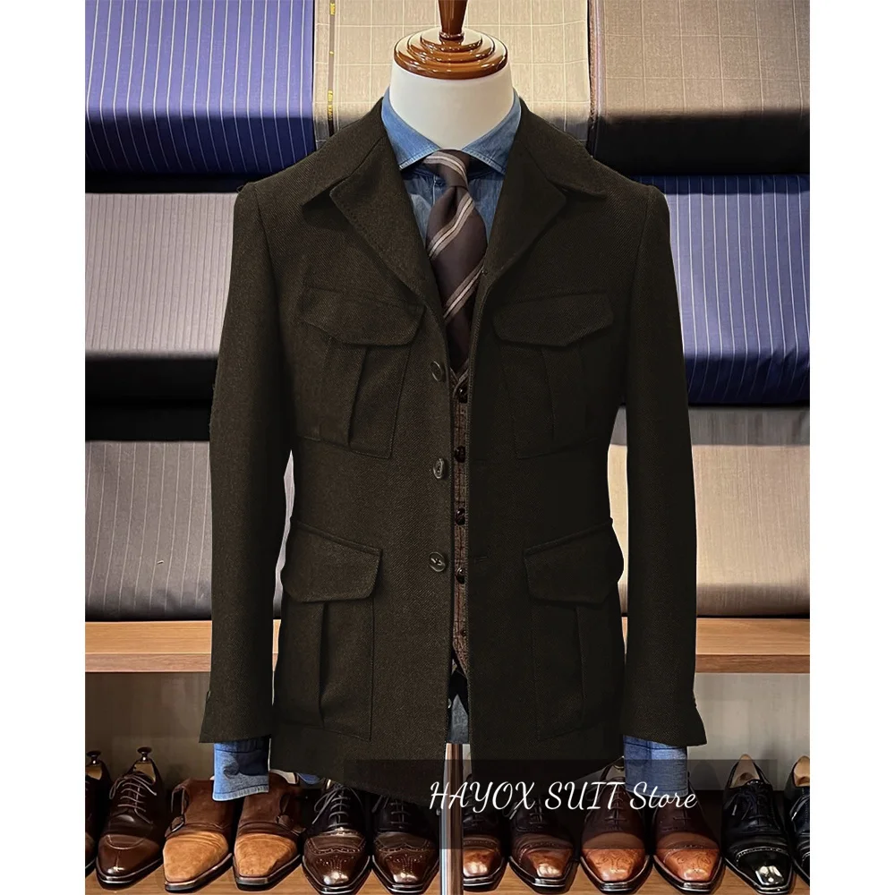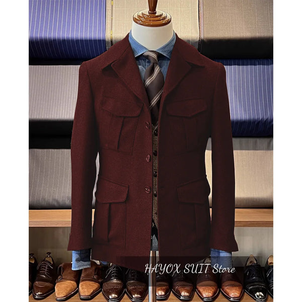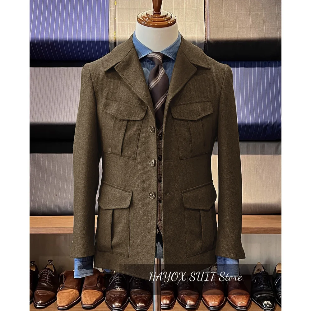 Vintage Tweed Herringbone Men's Blazer with Four Pockets