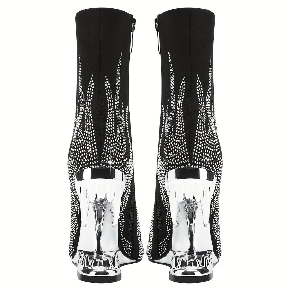 Add a touch of drama and elegance to your evening wear with our Glamorous Rhinestone Heels. Featuring a striking flame pattern and shimmering rhinestones, these heels are crafted to make a bold statement at any party or nightclub event. The pointed toe design and stylish side zipper not only enhance the chic look but also ensure a snug, comfortable fit. Let your feet do the talking with these eye-catching ankle booties that are perfect for any fashion-forward woman.