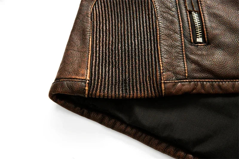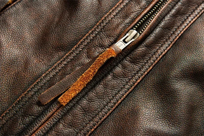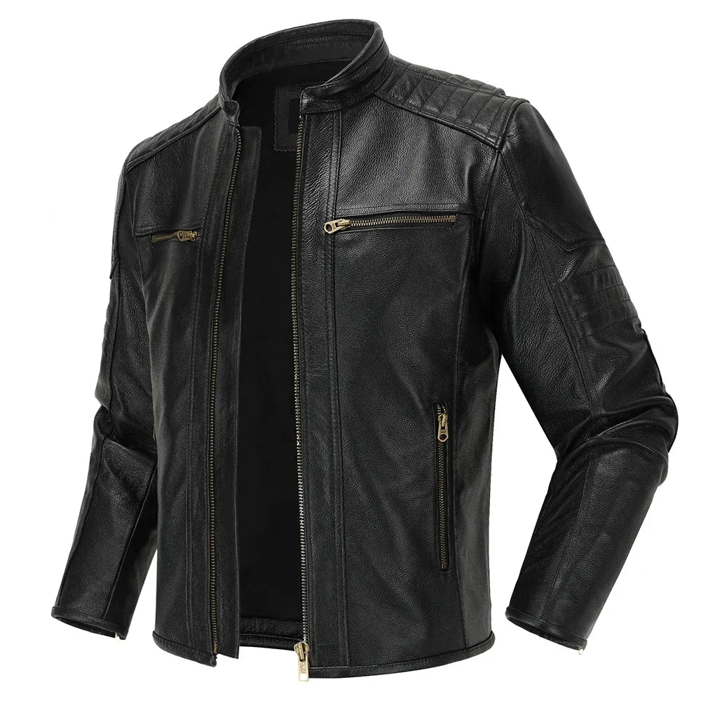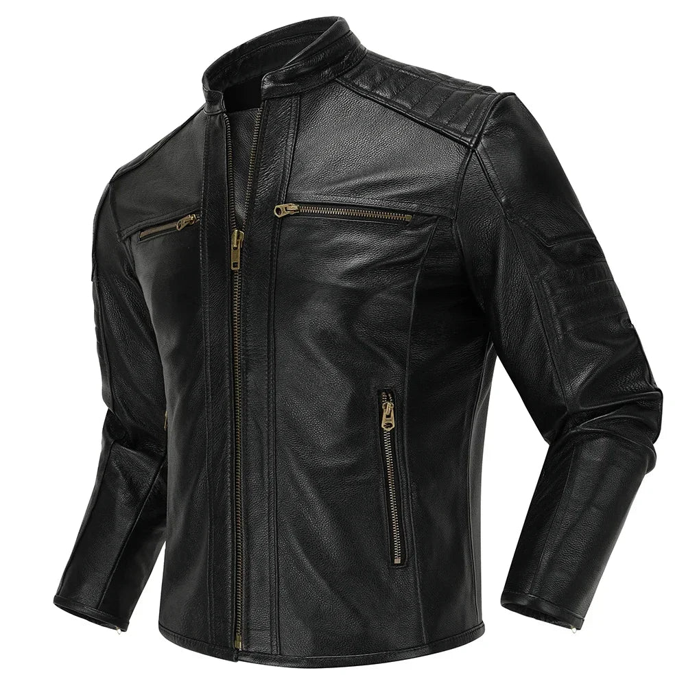 Premium men's leather biker jacket in rich brown with stand collar, crafted from durable first-layer calfskin leather.