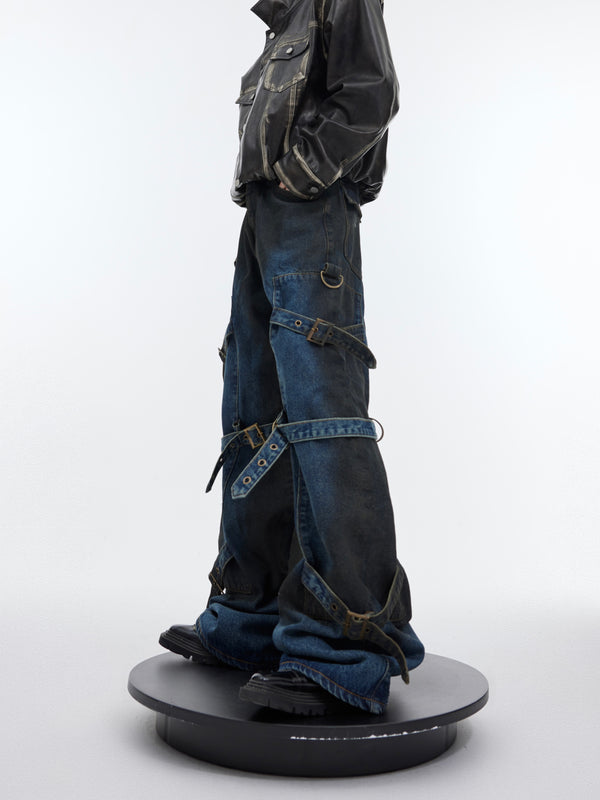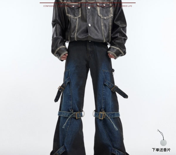 Vintage High-Waist Denim Trousers with Metal Buckle & Lace-Up Design