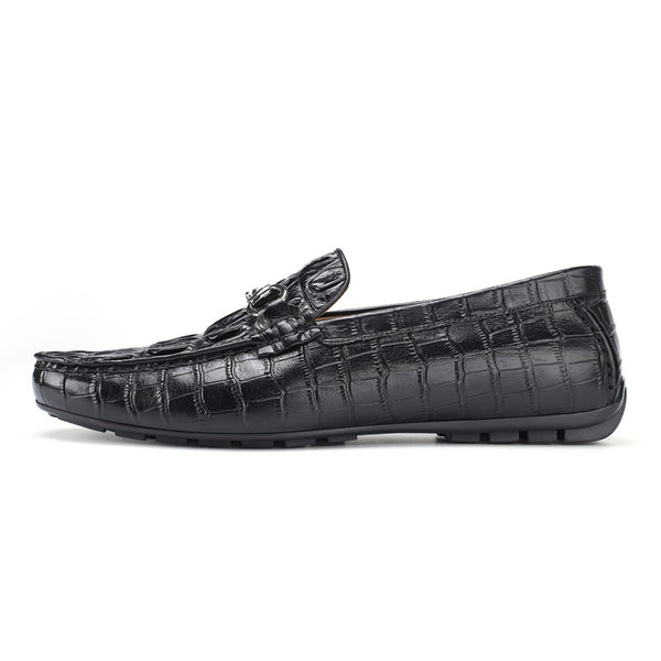 Men's Genuine Leather Crocodile Skin Casual Shoes in Black - Handcrafted, Flat Heel, Stylish and Comfortable - Sizes 38-44