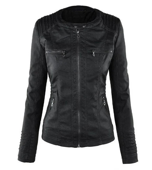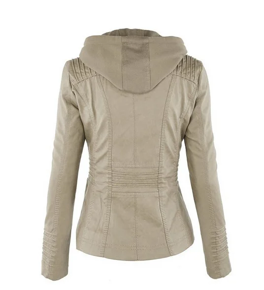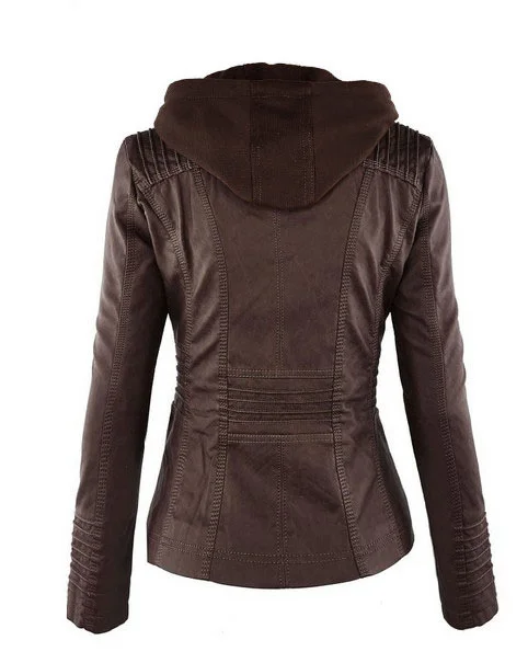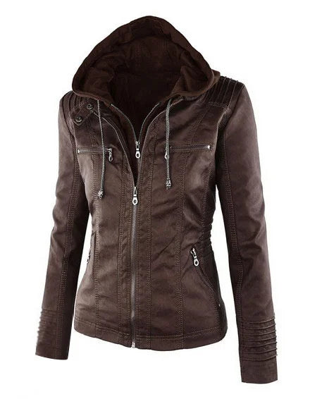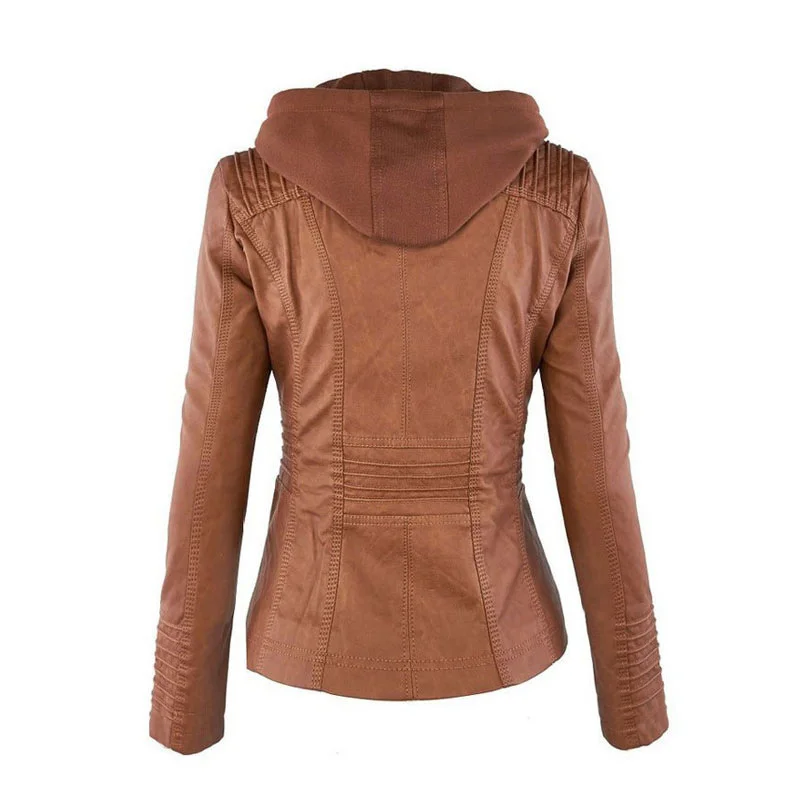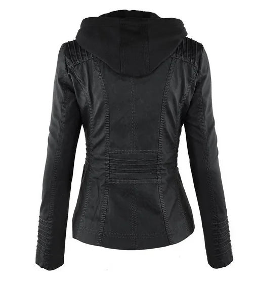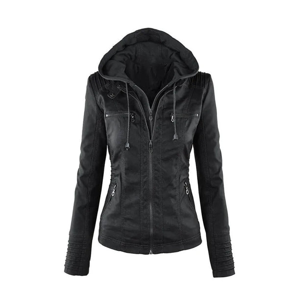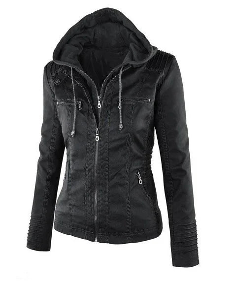 Chic hooded faux leather jacket for women in black, perfect for autumn and winter, featuring a detachable hood and zip-up clo