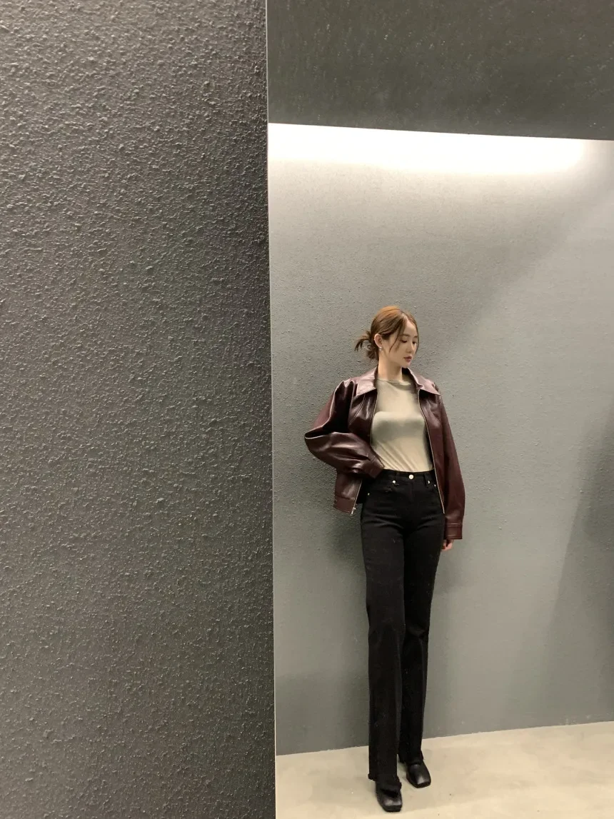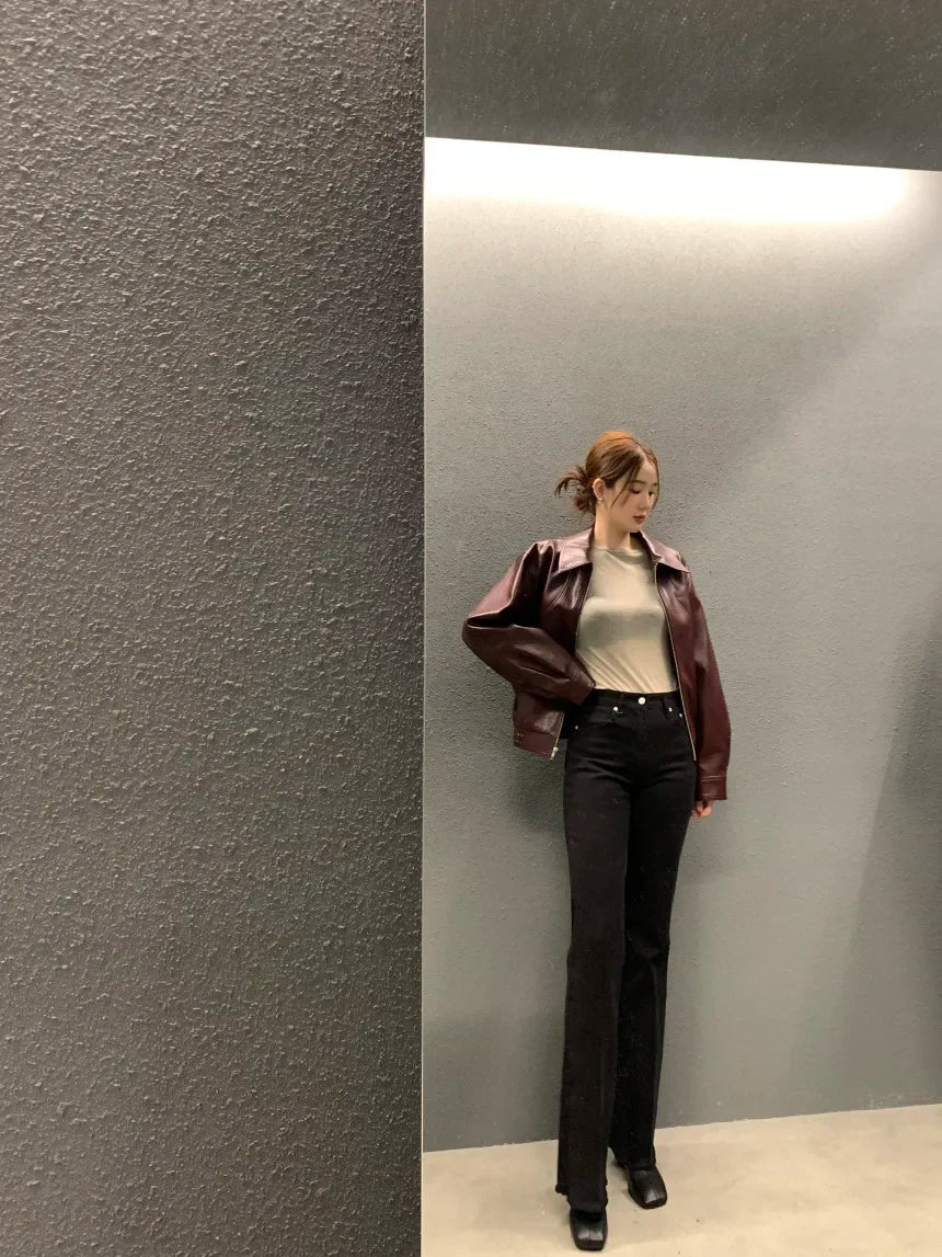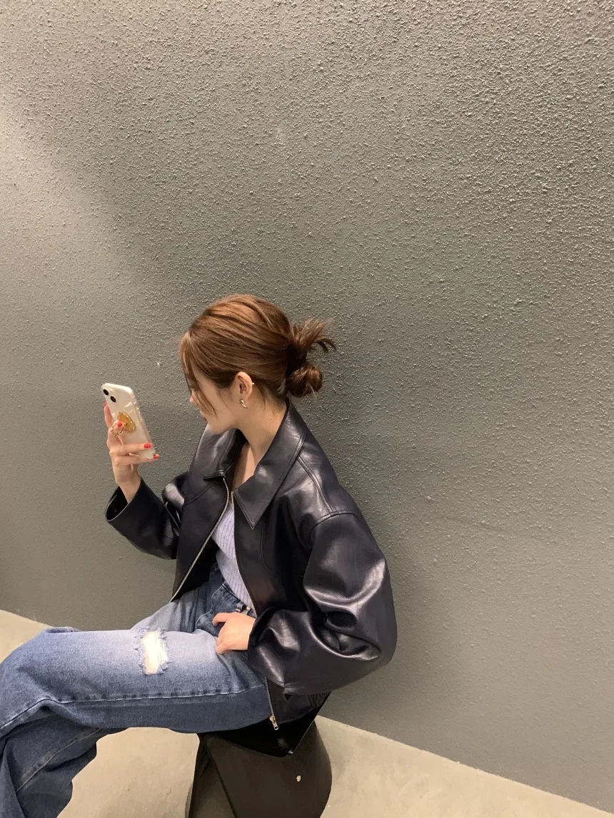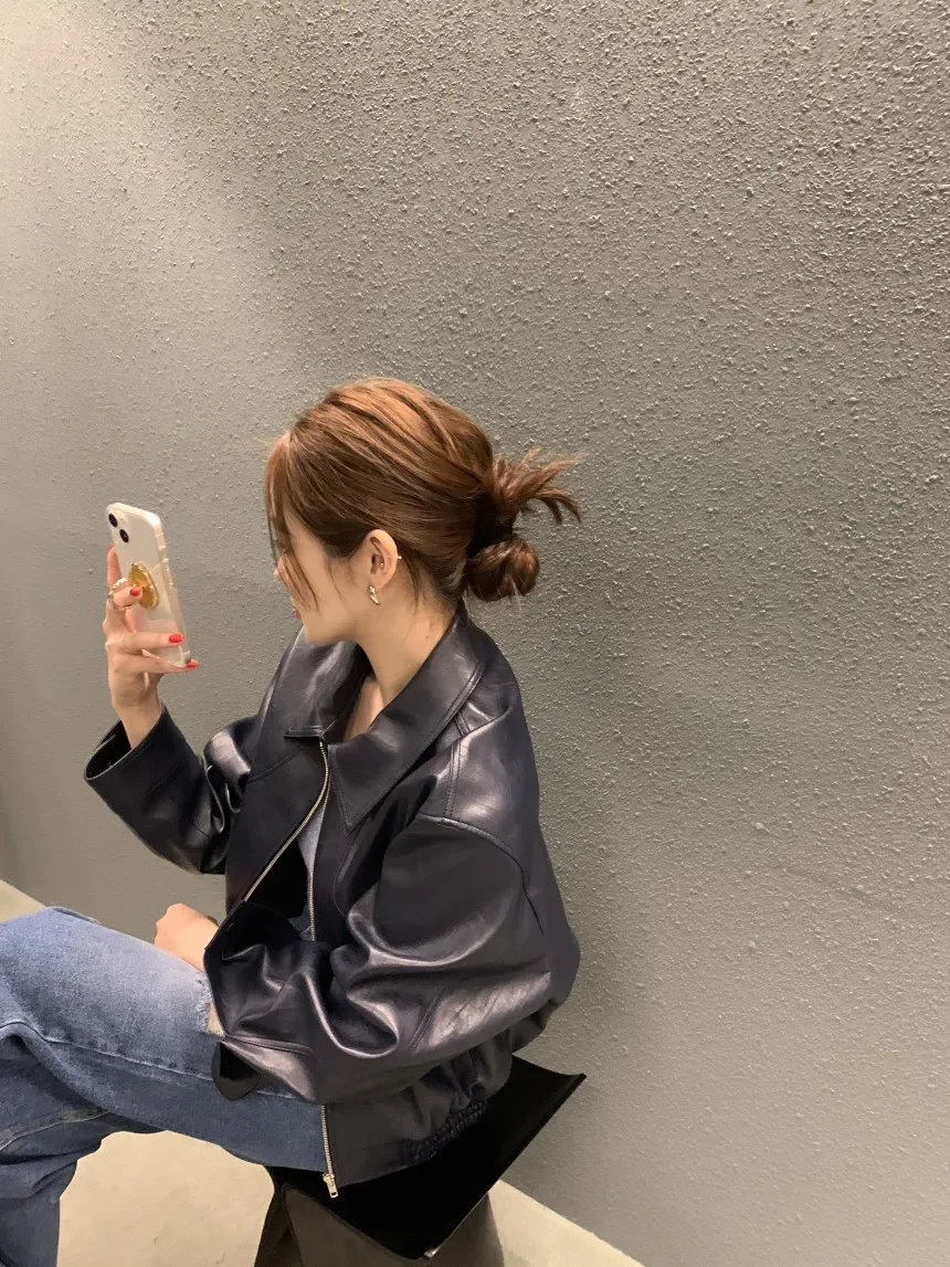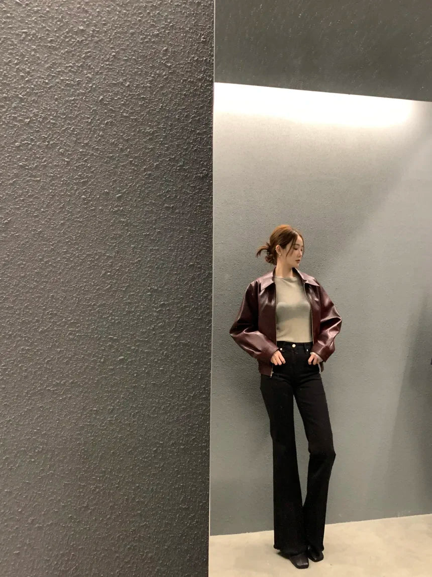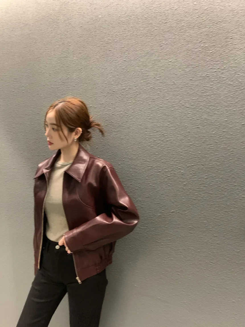 With a flattering cropped cut and a classic turn-down collar, this jacket features a smooth zipper closure that adds both form and function. Its lightweight composition offers comfort and flexibility, making it an ideal choice for both autumn and winter wear.