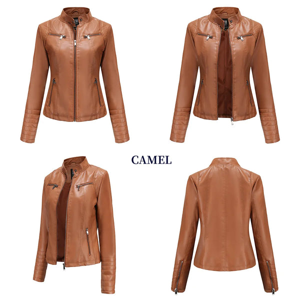 Chic women's slim leather biker jacket with zip detail, stand-up collar, and tailored fit for a stylish urban look.