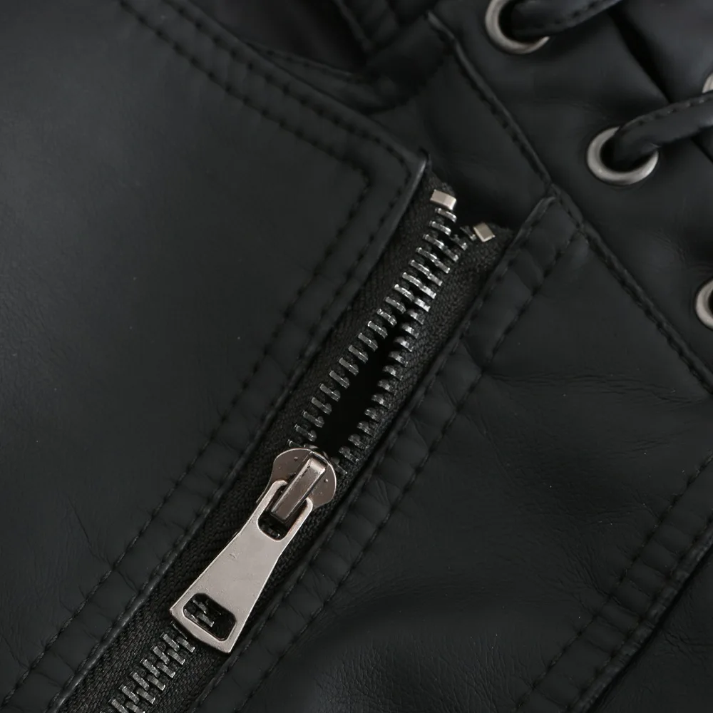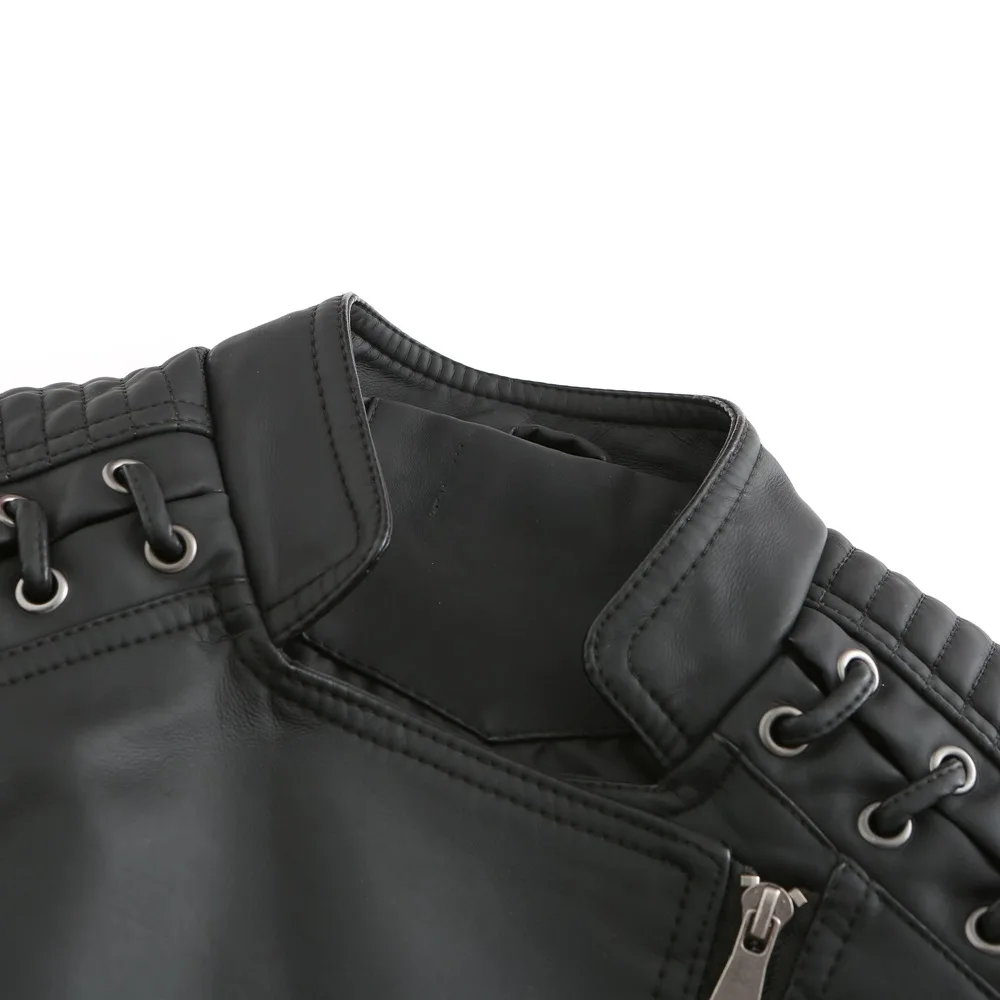 Available in classic black, this motorcycle jacket combines functionality with a sleek, form-fitting design, making it an essential piece for any fashion-forward motorcyclist. The robust zipper closure provides secure and adjustable fitting while enhancing the jacket's edgy look.