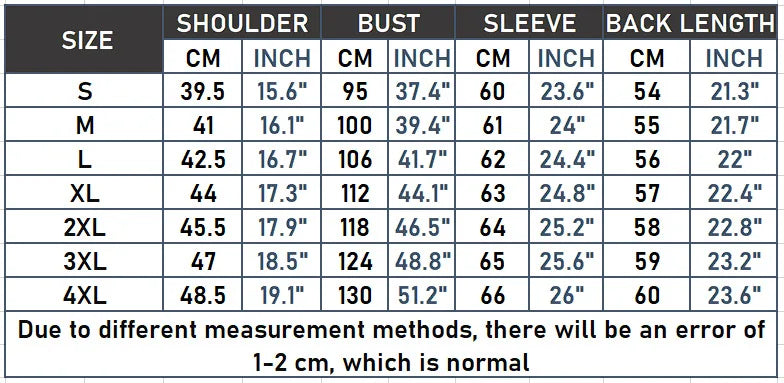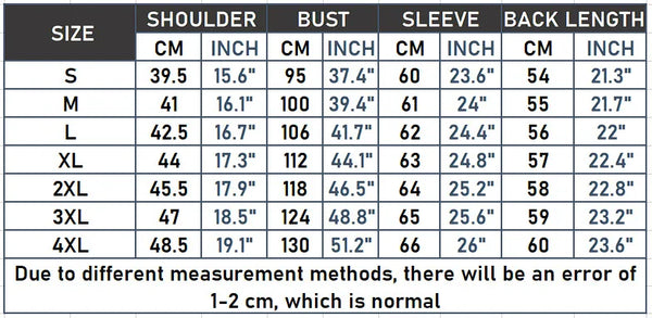 | Label | US/EU approx | Chest (cm) | Shoulder (cm) |