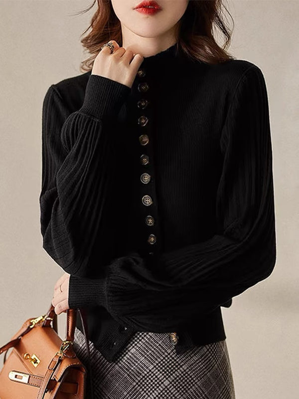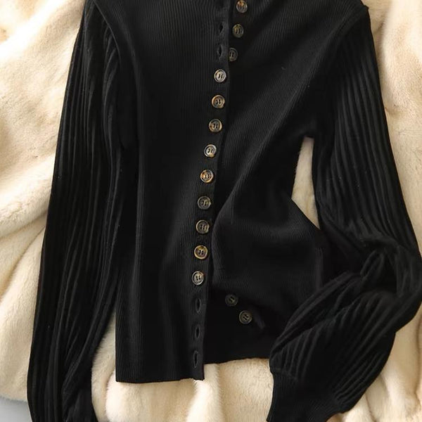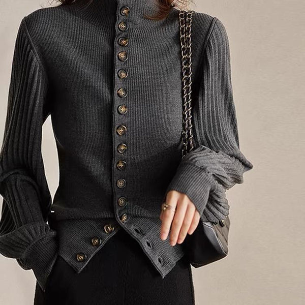 Chic Patchwork Knitted Cardigan with Stand-up Collar - Retro Elegance Style - Gray and Black - Women's Fashion