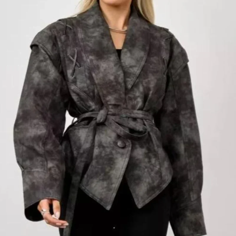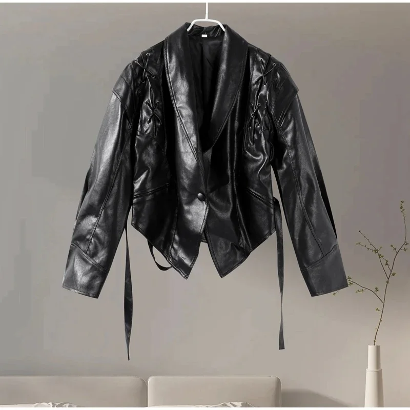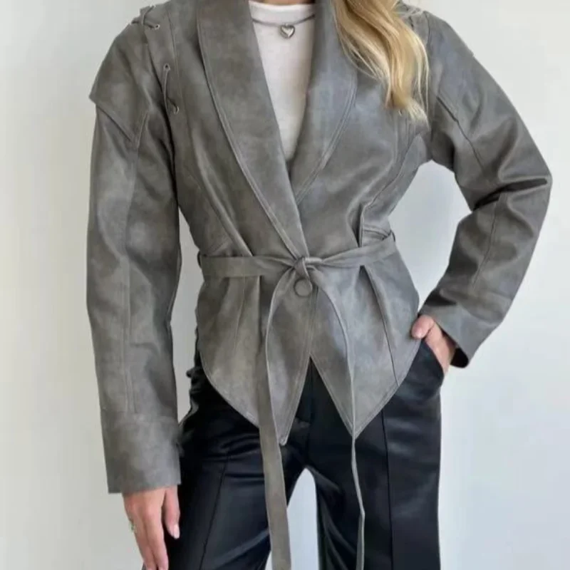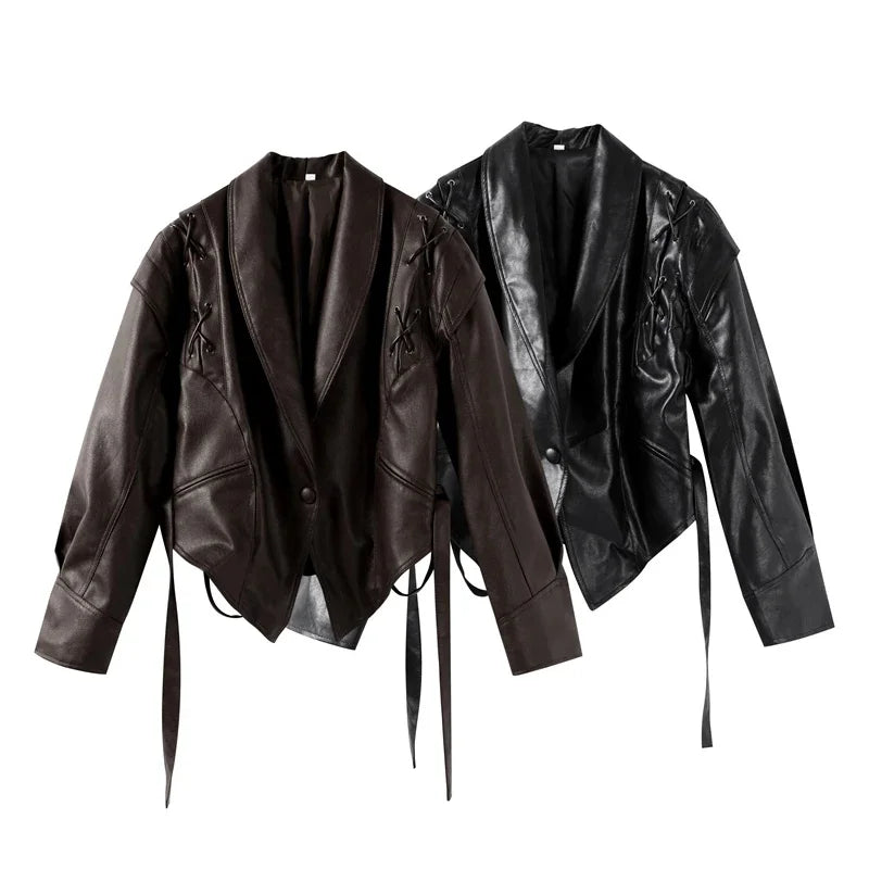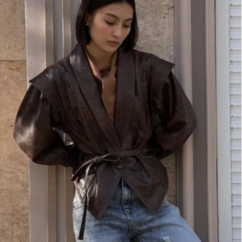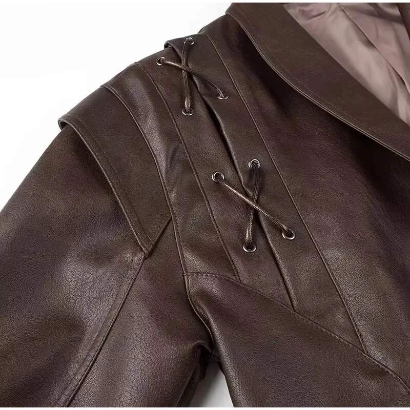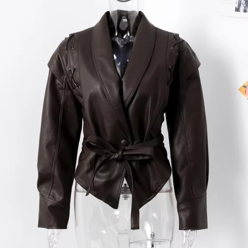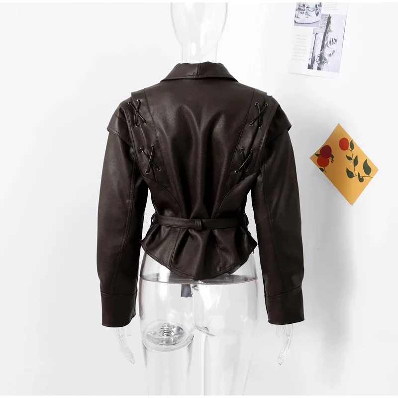Chic belted leather bomber jacket for women, featuring lace-up detail, hood, and notched lapel, perfect for autumn and winter