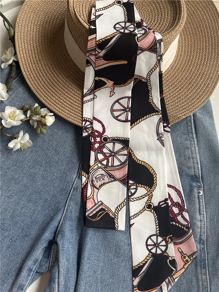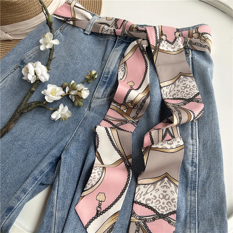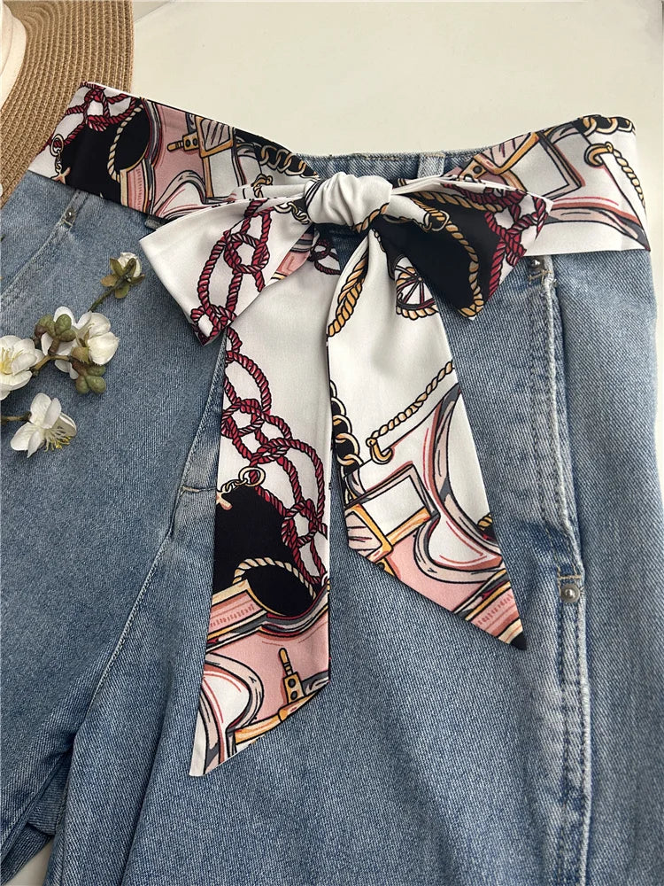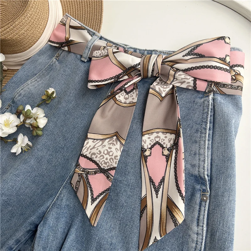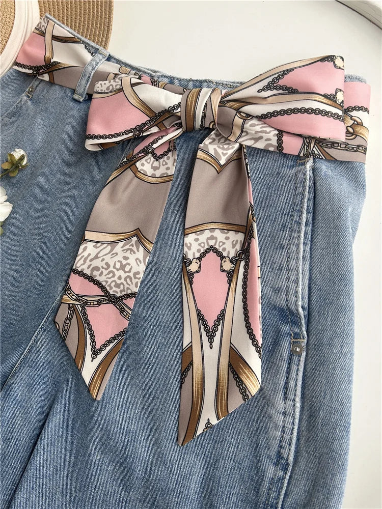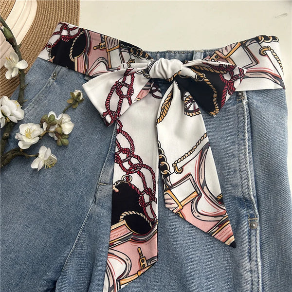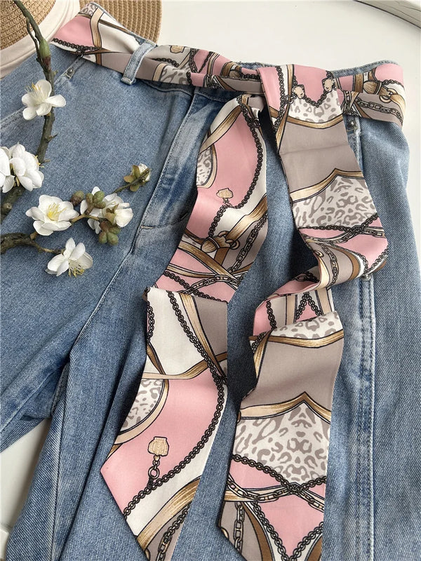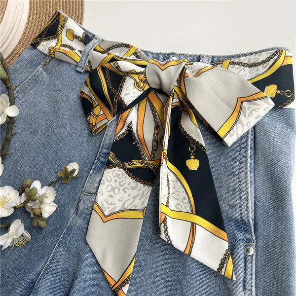 Chic fabric belt for women with geometric design, versatile for dresses, jeans, or as a scarf and headband accessory.