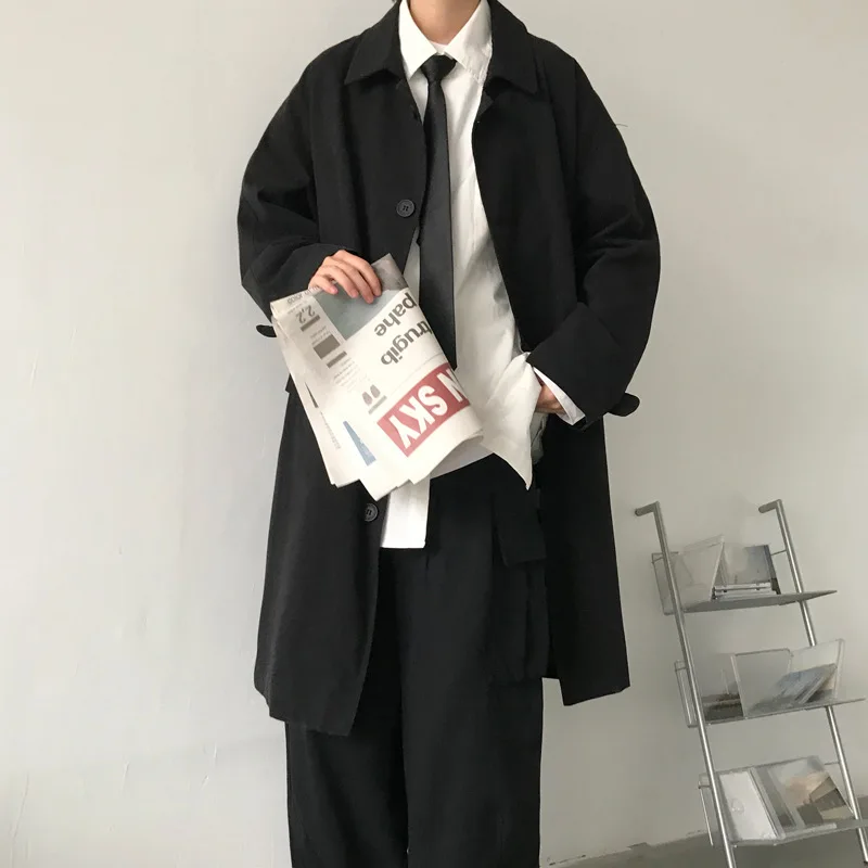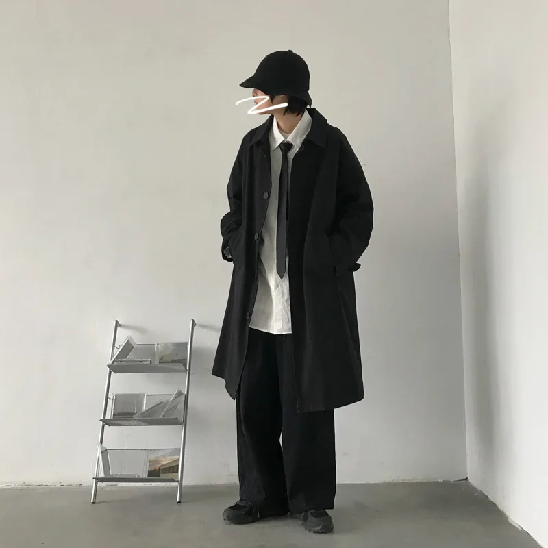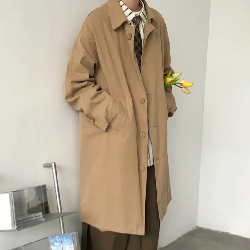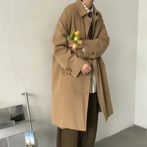 The trench coat's long silhouette and turn-down collar echo a refined English fashion sense, while the simple yet fashionable design adapts seamlessly to any setting. Its loose fit ensures easy layering over sweaters or suits, making it a versatile addition to your outerwear collection.