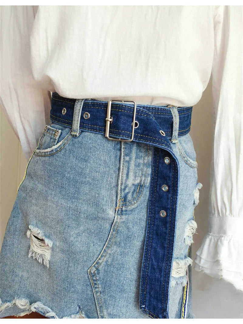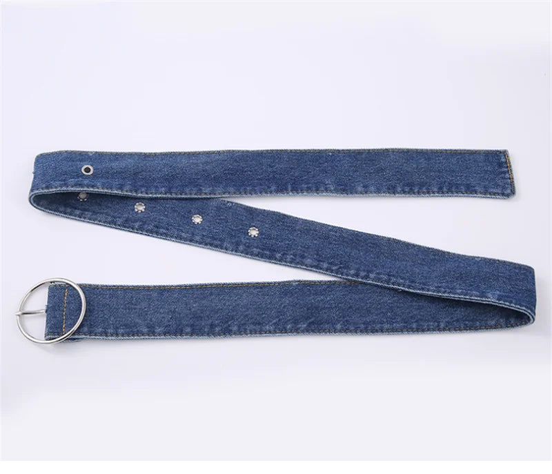 Chic wide denim belt with pin buckle for women, perfect for casual and semi-formal outfits, enhancing your silhouette.