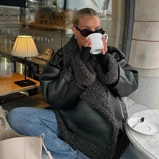 Chic Women's Faux Fur Belted Jacket | PU Leather Trimming