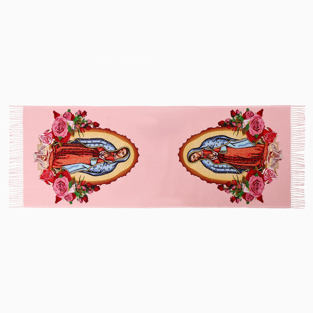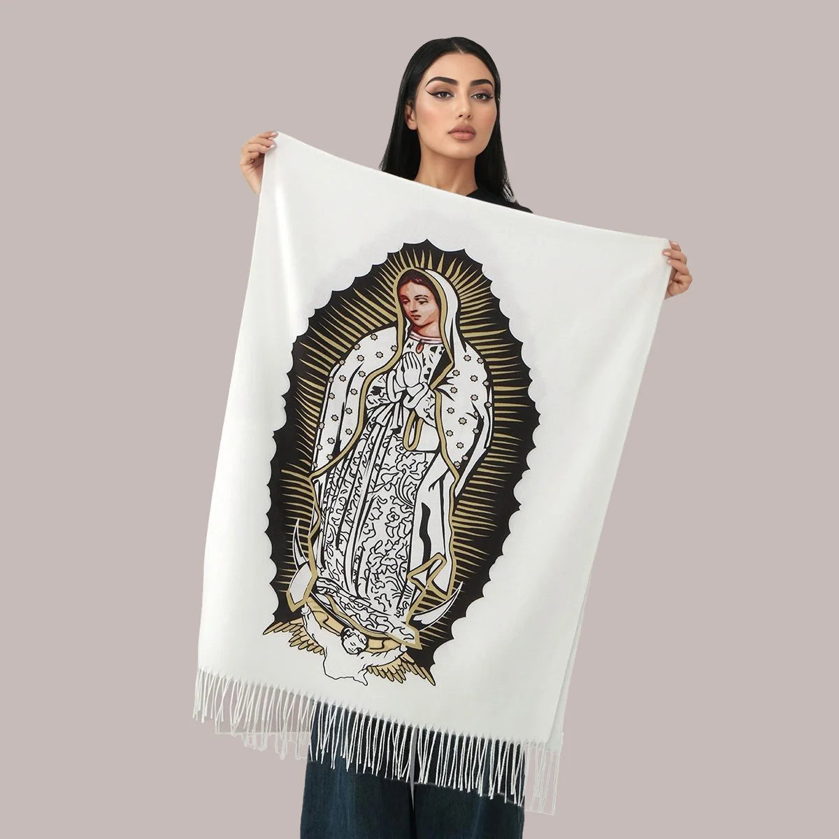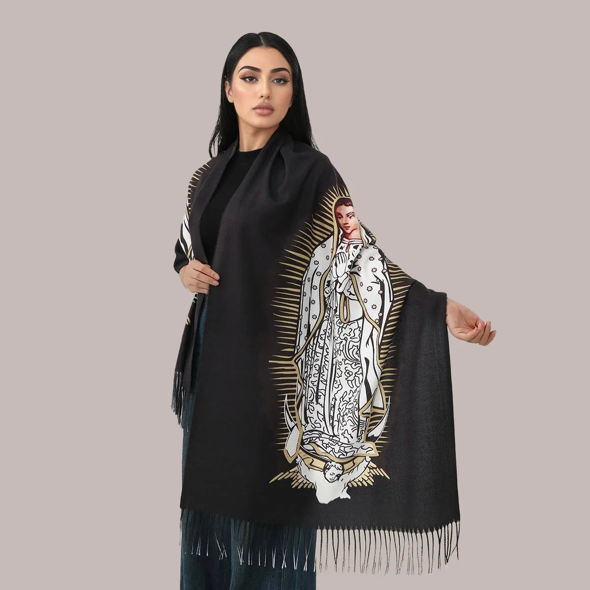 This scarf isn't just about staying warm; it's a wearable testament to faith and artistry. Inspired by the iconic Virgin Mary of Guadalupe, it’s designed for those who cherish their beliefs and want to express them with grace. Whether you're attending a candlelit service or just wrapping up a day at the office, this scarf stands as a symbol of protection and peace. The soft polyester flows beautifully, shimmering gently in low light, making it a perfect blend of function and solemn beauty.