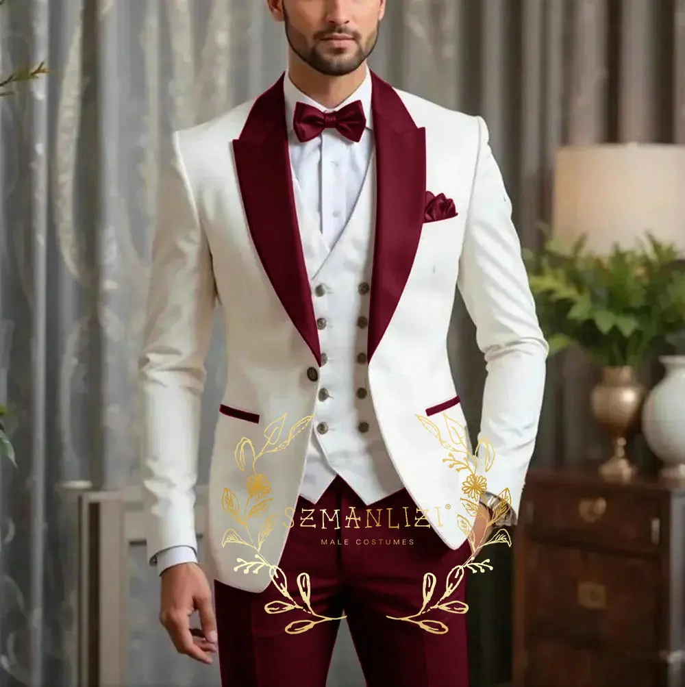 Luxury Men's Wedding Suit Set in Ivory & Burgundy