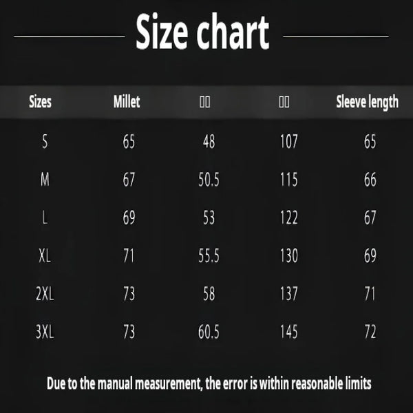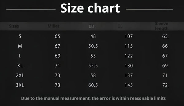 | 3XL | 122–128 | 48–50.5 | 108–115 | 42.5–45.5 | Extended |