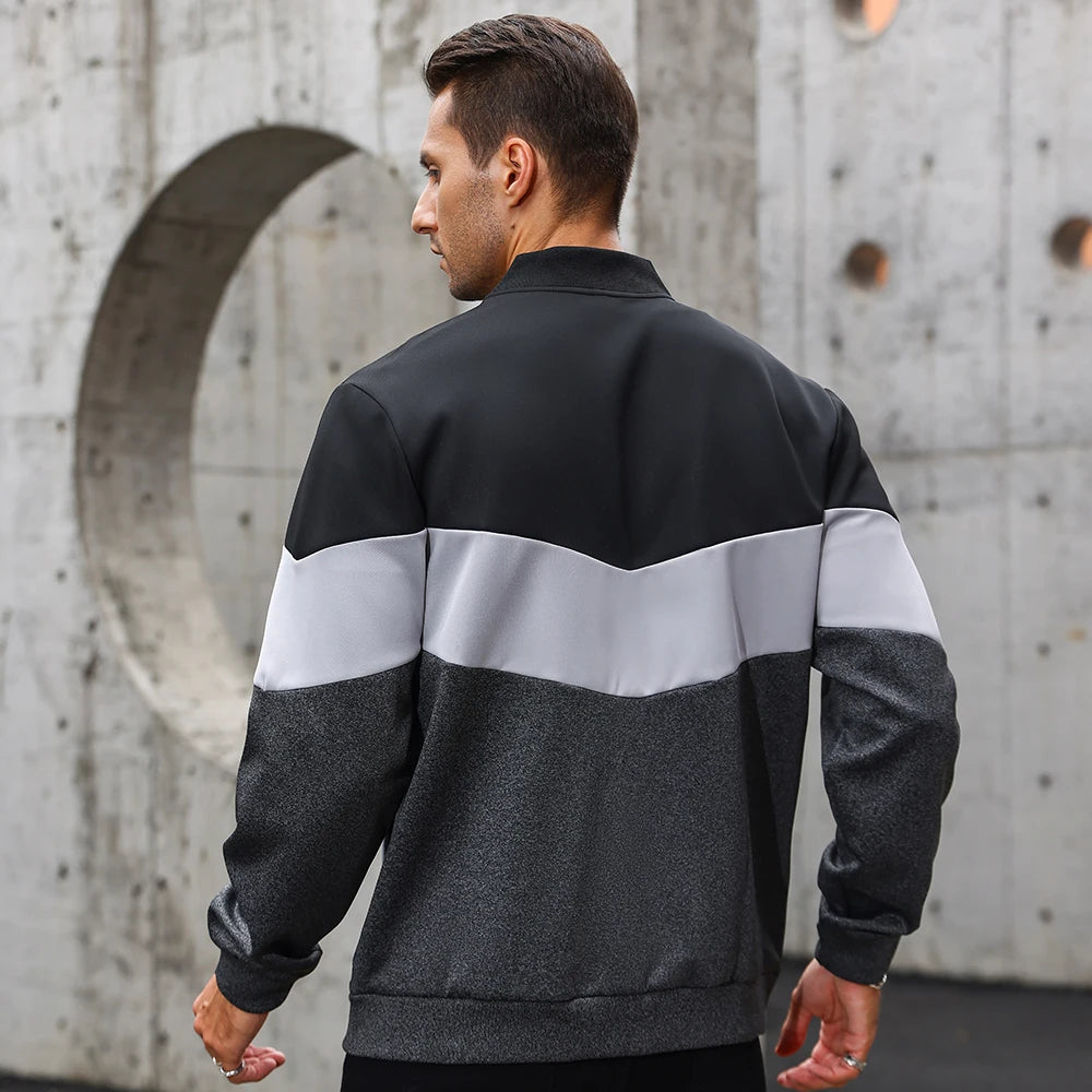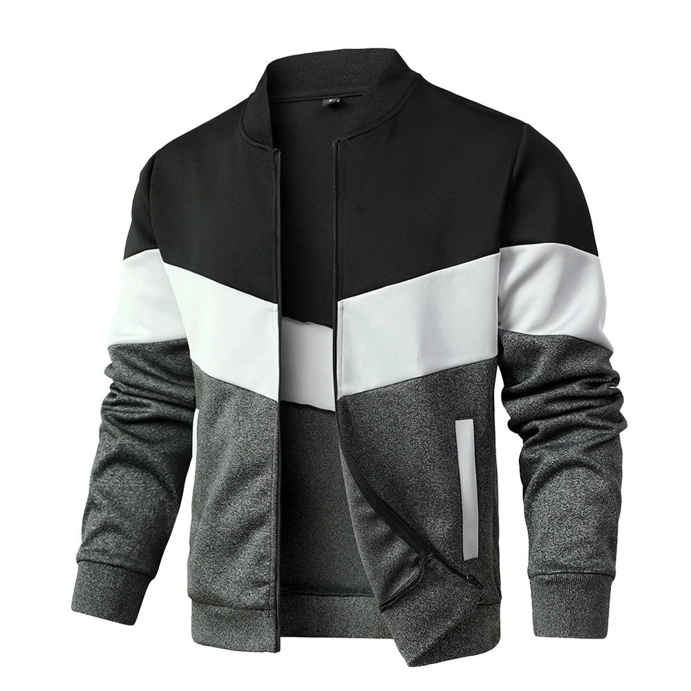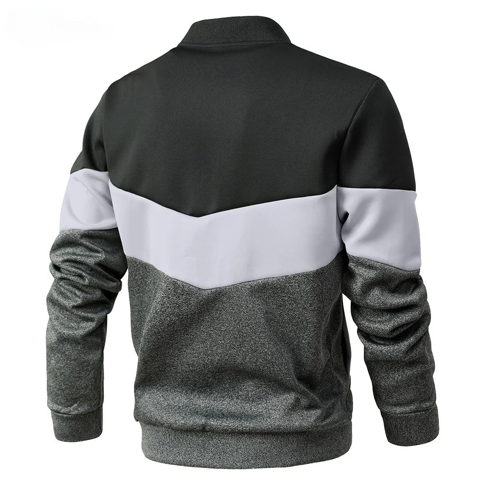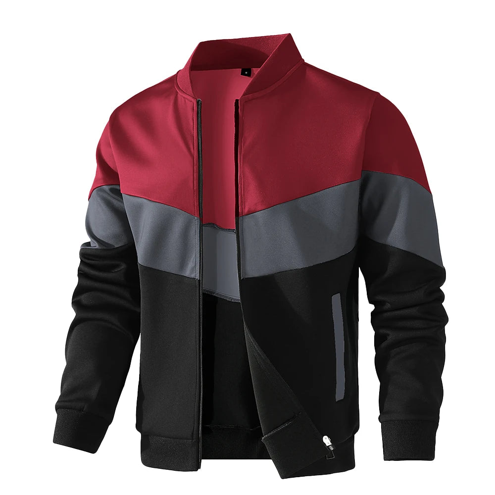 Designed with a striking color block pattern and constructed from high-quality materials, this bomber jacket not only stands out but also stands the test of time. Its practical zip-up design ensures convenience while the stylish stand-up collar provides added warmth and sophistication. Whether paired with jeans or trousers, this jacket elevates any outfit effortlessly.